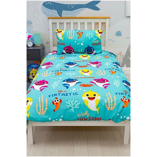 Doo-doo-doo! Your little shark will dive into a deep sea dreamland with this fin-tastic reversible baby shark single bedding set. Complete with a matching pillow case, these adorable bed-sheets are blue on one side and white on the reverse, each featuring alternate designs of baby shark, mummy shark and daddy shark with the slogans totally Jawsome, Life is Fantastic and Seas the Day. Snap up the most jaw-some dreams for your little Baby Shark fan with this fun duvet set.