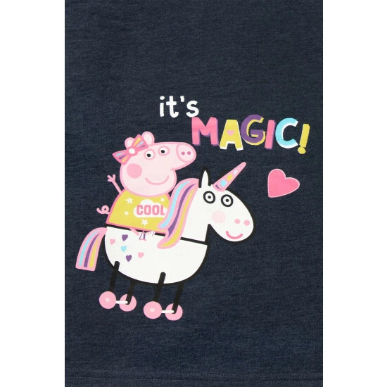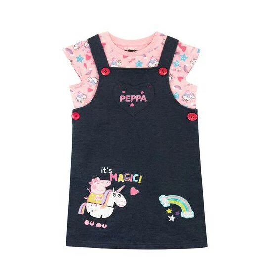 For all little piglets who love to jump up and down in muddy puddles in their wellingtons, make their day extra enjoyable with this adorable pinafore set! The perfect outfit for little piglets, this oink-tastic ensemble includes a denim blue pinafore with a detachable patterned short sleeve top underneath. Featuring everyones s no.1 piggy Peppa Pig with rainbows and unicorns, this is sure to brighten up summer days even more for your own sweet little piglet!