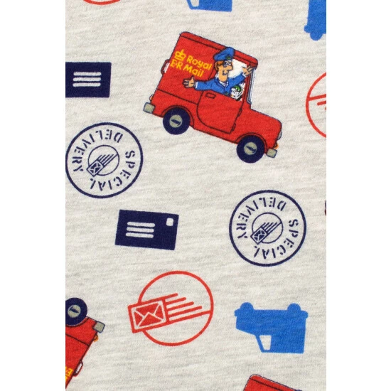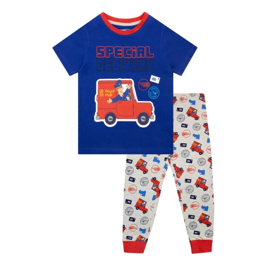 Watch them escape into the peaceful world of Postman Pat and his black and white cat with these adorable Postman Pat pyjamas! Showcasing Pat in his red van, this blue short sleeve pyjama top also features the puff print slogan Special Delivery written across the chest. The matching pj bottoms are light grey with an all-over pattern of Pat in his van and various postage stamps, and have an elastic waistband and red ankle cuffs for extra comfort. These cute PJs are sure to deliver the sweetest dreams to your little Postman Pat fan!