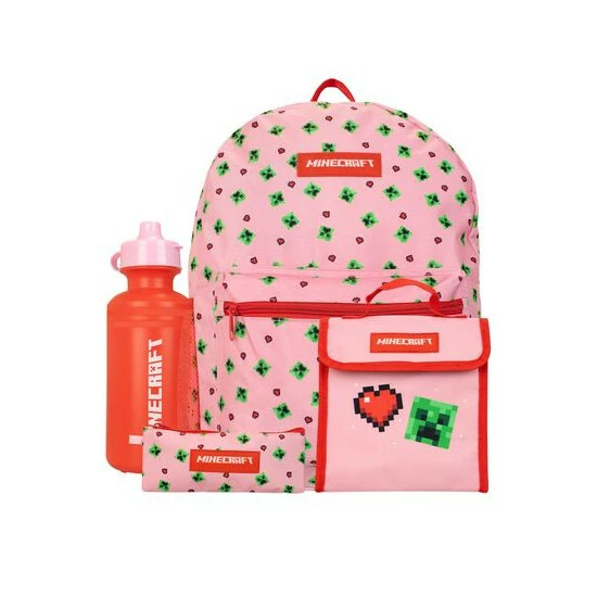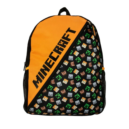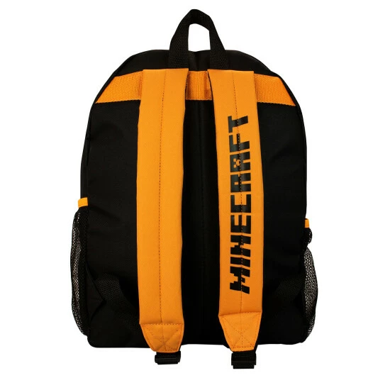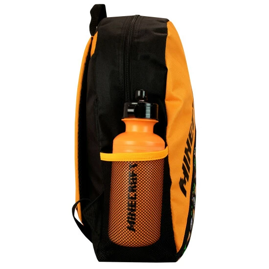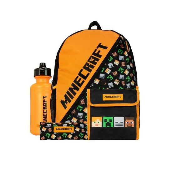 Get your gamer kitted out for a wild adventure with this striking 4-piece backpack set! The main bag has two mesh side pockets and a large front pocket with a diagonal zip and rubber Minecraft zip pull, dividing an orange panel with Minecraft print in black lettering and a black panel with an all-over print of characters Steve, Alex, Creepers and Skeletons. Comes with a pencil case with a matching pattern, an orange water bottle with Minecraft printed on the side and a black lunch bag with an orange Minecraft patch and a print of each character s face on the front. With this vibrant gaming rucksack set, your gamer will be equipped for a great day at school or a fun adventure exploring the wild world of Minecraft! Approximate Dimensions: Backpack H: 38 x W: 30 x D: 17 cm, Lunch bag H: 22 x W: 20 x D: 9 cm Pencil Case H: 7.5 x W: 20 x D: 1 cm.