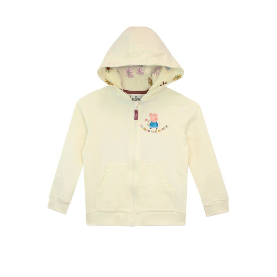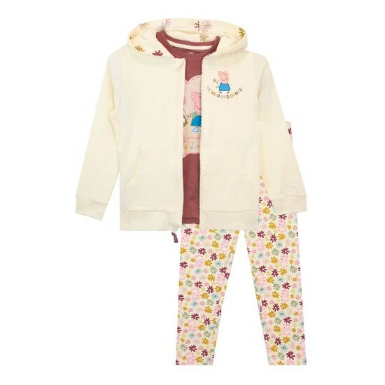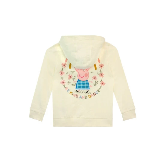 Spread love and kindness with this charming Peppa Pig three-piece outfit! This set includes a zip-up hoodie, top and leggings. The cream hoodie has pockets and a floral lining in the hood, and showcases Peppa on the chest with the slogan Be Kind and Dance with the same slogan printed on the back with a large image of Peppa surrounded by flowers. The blush red t-shirt has stylish frills on the sleeves and a print of Peppa against a heart-shaped background, watering flowers with the slogan Growing Love . The matching leggings are cream with a floral print! Your little piglet will love to wear this cute combo together or separately to create a range of Peppa-licious outfits!