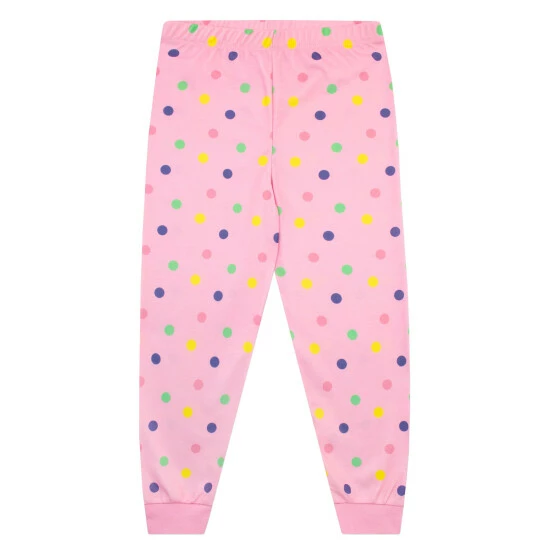 With this Peppa Pig pyjama and nightdress set, your little piglet can join Peppa for oinktastic dreamland adventures no matter what the season! The pyjamas include a white top showcasing Peppa Pig and Zoe Zebra with High Five written on a colourful flower, and has contrasting pink sleeves with multicoloured polka dots. The pyjama bottoms match the sleeves and have an elasticated waistband and cuffed ankles for extra comfort. The short sleeve purple nightie is a great choice for warmer nights, featuring a fun print of Peppa and George Pig jumping over a rainbow surrounded by stars, with the slogan Dreams really do come true written in white swirly font. Your Peppa fan will love to show off their favourite cartoon all year round with this cute colourful sleepwear!