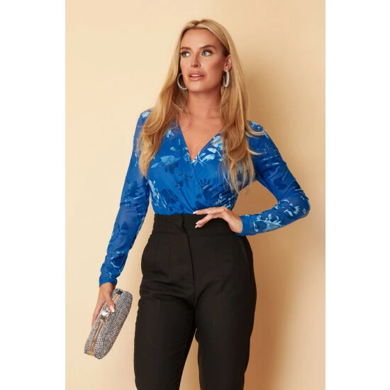 Add some glam to your wardrobe this season with our Eloise Cobalt Floral Wrap Bodysuit. Featuring a delicate floral design in a velour burnout fabric, long sleeves and a wrap over neckline. Pair with leather look trousers & heels to create the perfect party look. The model wears a UK size 8 and is 5’6. Measurements are based on a UK size 8 sample. Add 5cm per size up and only 1cm for length. Bust: 80cm Waist: 58cm